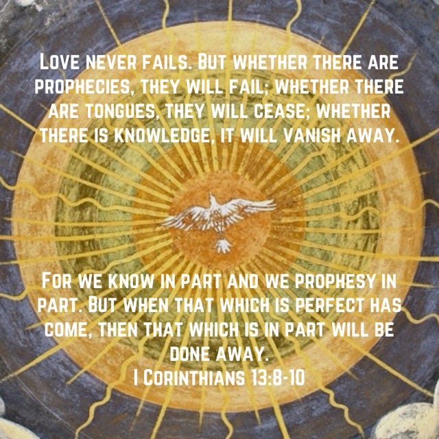 Some people use this scripture to say God is going to do away with prophecy and tongues, some even go as far as to say that when we received the written word of God that all the gifts ceased. But no one ever says knowledge has ceased. Why? This scripture is not about the gifts ceasing its about the part of ourselves that limits these spiritual gifts ceasing. We will operate fully in the gifts because we will be perfected. Tongues will become our fluent form of communication. We will see clearly from the beginning to the end fully operating in prophecy. Our flawed human understanding will no longer be the filter we use to experience knowledge because we will be one with the Spirit of Truth. The Holy Spirit is in the process of leading us into all truth so all of our operations in the gifts are filtered through our own minds, this is why these gifts are only in part at this point in our journey. When we see Him we will be like Him we will fluently speak our heavenly language. Every word we speak will be prophetic. Our knowledge will be drawn directly from Him not from any other limited source. I can’t wait for the “part” or “partial” to be done away with.